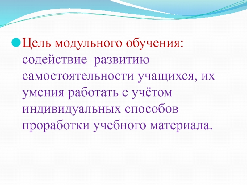 Цель модульного обучения: содействие развитию самостоятельности учащихся, их умения работать с учётом индивидуальных способов проработки учебного материала.