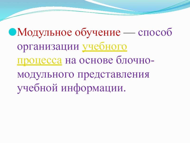Слайд 3Модульное обучение — способ организации учебного процесса на основе блочно-модульного представления учебной информации.