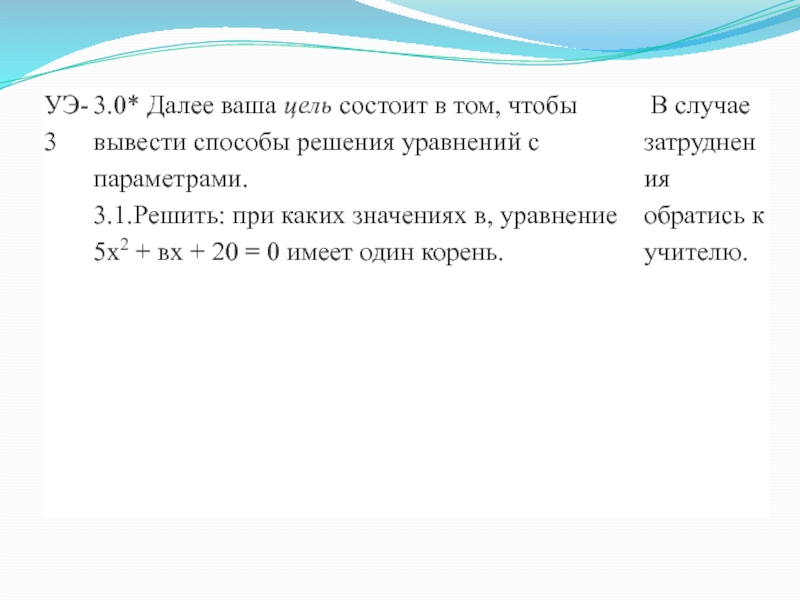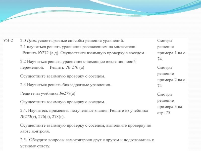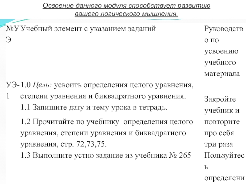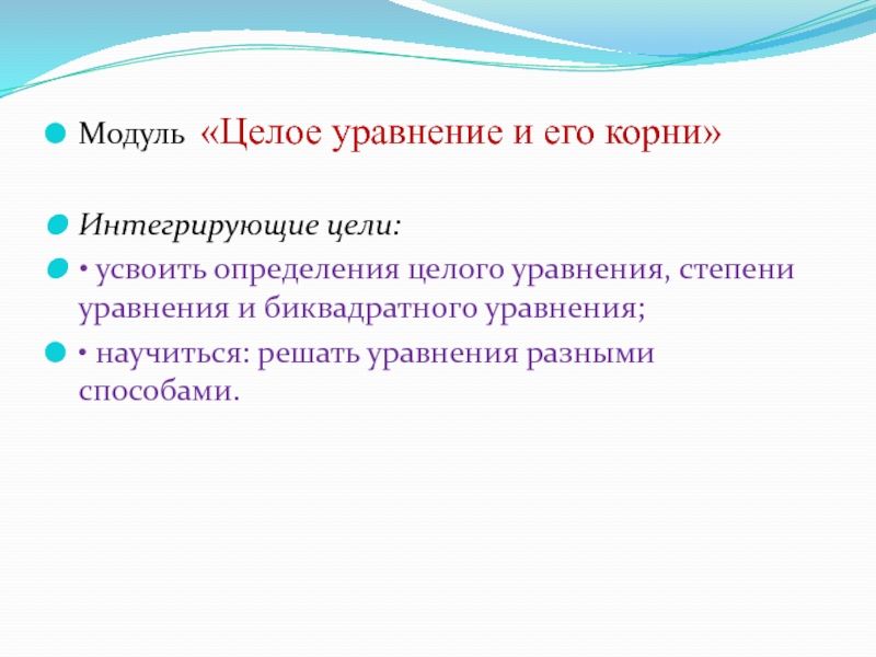 Модуль «Целое уравнение и его корни»Интегрирующие цели:• усвоить определения целого уравнения, степени уравнения и биквадратного уравнения;• научиться: решать