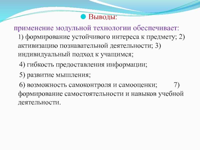 Выводы: применение модульной технологии обеспечивает: 1) формирование устойчивого интереса к предмету; 2)активизацию познавательной деятельности; 3)индивидуальный подход к