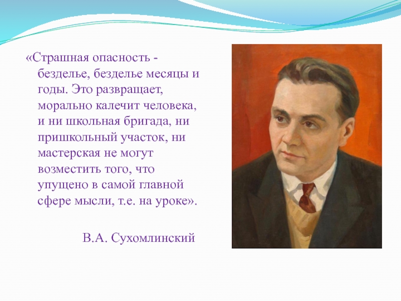 «Страшная опасность - безделье, безделье месяцы и годы. Это развращает, морально калечит человека, и ни школьная бригада, ни пришкольный участок, ни мастерская не могут возместить того, что упущено в самой главной сфере мысли, т.е. на уроке».