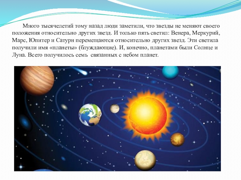 звезды не меняют своего положения относительно других звезд. И только пять светил: Венера, Меркурий, Марс, Юпитер и Сатурн перемещаются относительно других звезд. Эти светила получили имя «планеты» (блуждающие). И, конечно, планетами были Солнце и Луна. Всего получилось семь связанных с небом планет.