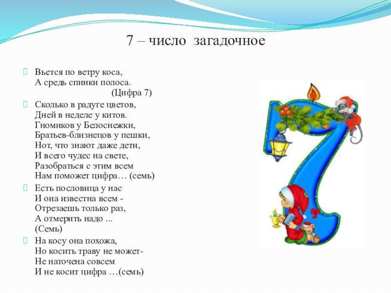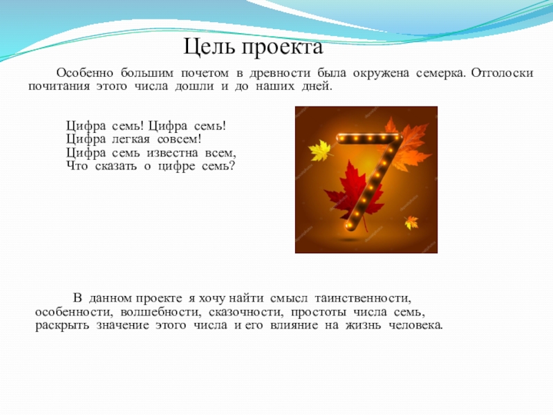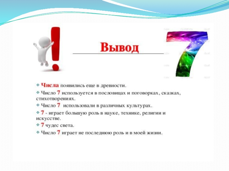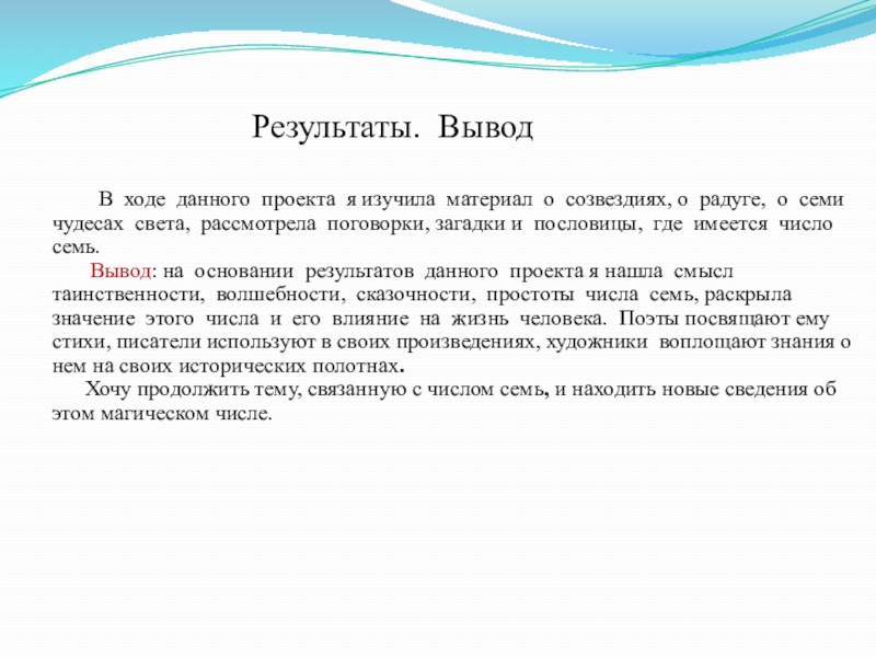 Вывод: на основании результатов данного проекта я нашла смысл таинственности, волшебности, сказочности, простоты числа семь, раскрыла значение этого числа и его влияние на жизнь человека. Поэты посвящают ему стихи, писатели используют в своих произведениях, художники воплощают знания о нем на своих исторических полотнах.
