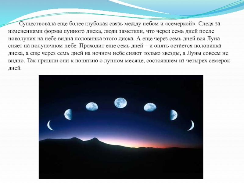 и «семеркой». Следя за изменениями формы лунного диска, люди заметили, что через семь дней после новолуния на небе видна половинка этого диска. А еще через семь дней вся Луна сияет на полуночном небе. Проходит еще семь дней – и опять остается половинка диска, а еще через семь дней на ночном небе сияют только звезды, а Луны совсем не видно. Так пришли они к понятию о лунном месяце, состоявшем из четырех семерок дней.