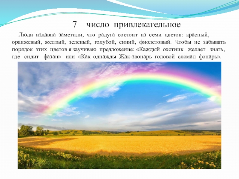 Люди издавна заметили, что радуга состоит из семи цветов: красный, оранжевый, желтый, зеленый, голубой, синий, фиолетовый. Чтобы не забывать порядок этих цветов я заучиваю предложение: «Каждый охотник желает знать, где сидит фазан» или «Как однажды Жак-звонарь головой сломал фонарь».