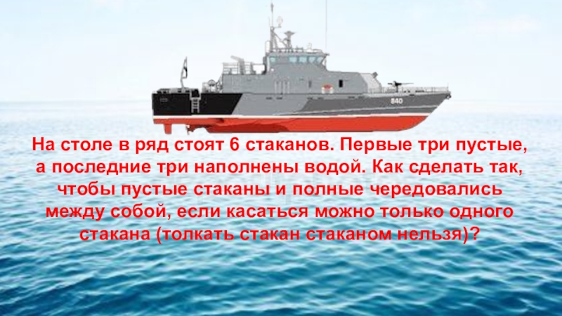 Слайд 12На столе в ряд стоят 6 стаканов. Первые три пустые, а