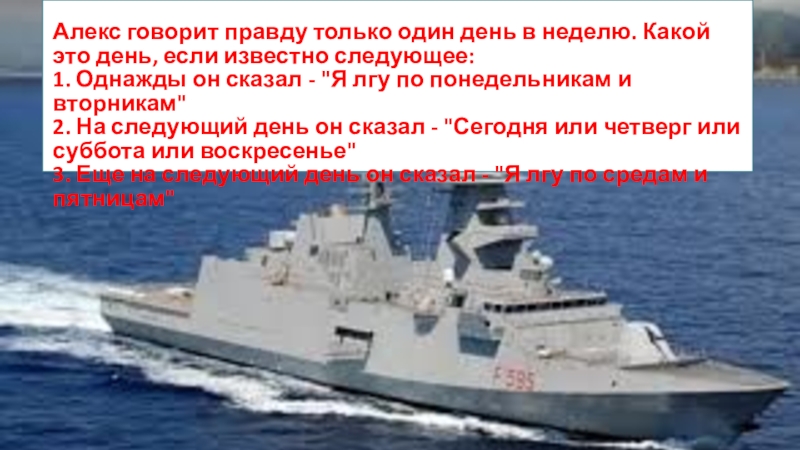 Слайд 20Алекс говорит правду только один день в неделю. Какой это день,