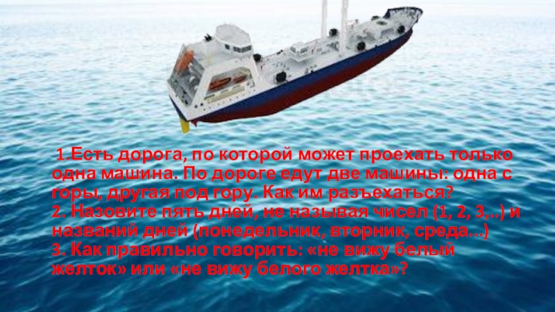 дороге едут две машины: одна с горы, другая под гору. Как им разъехаться? 2. Назовите пять дней, не называя чисел (1, 2, 3,..) и названий дней (понедельник, вторник, среда...) 3. Как правильно говорить: «не вижу белый желток» или «не вижу белого желтка»?