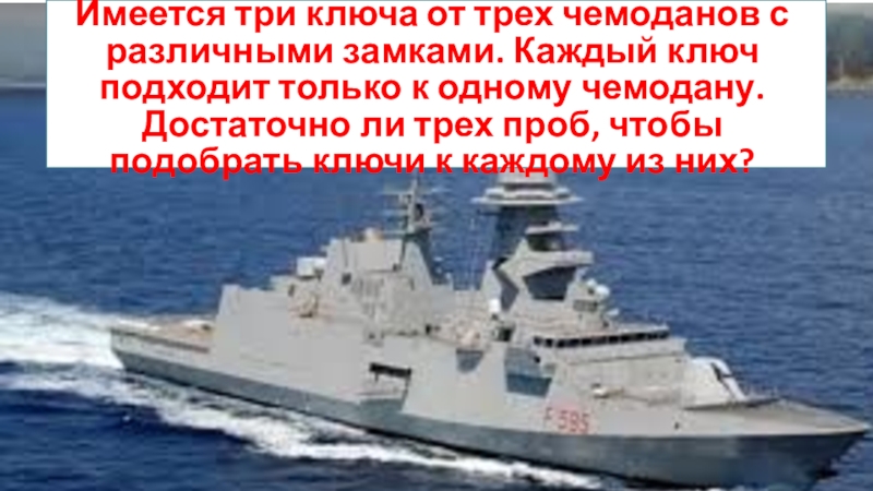 Слайд 21Имеется три ключа от трех чемоданов с различны­ми замками. Каждый ключ