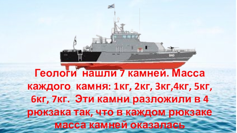 Слайд 8Геологи нашли 7 камней. Масса каждого камня: 1кг, 2кг, 3кг,4кг, 5кг,