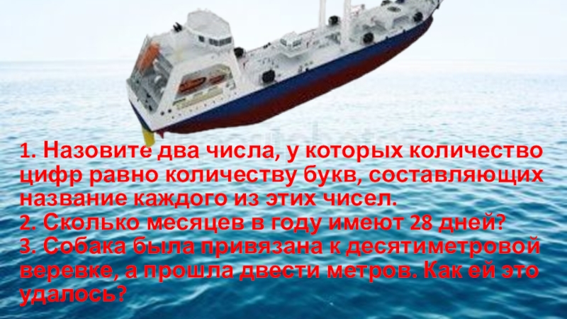 составляющих название каждого из этих чисел. 2. Сколько месяцев в году имеют 28 дней? 3. Собака была привязана к десятиметровой веревке, а прошла двести метров. Как ей это удалось?