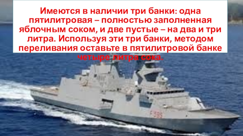Слайд 19Имеются в наличии три банки: одна пятилитровая – полностью заполненная яблочным