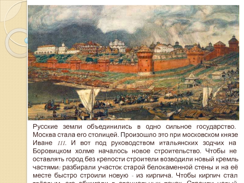 Произошло это при московском князе Иване III. И вот под руководством итальянских зодчих на Боровицком холме началось новое строительство. Чтобы не оставлять город без крепости строители возводили новый кремль частями: разбирали участок старой белокаменной стены и на её месте быстро строили новую - из кирпича. Чтобы кирпич стал твёрдым, его обжигали в специальных печах. Строили новый Кремль 10 лет.