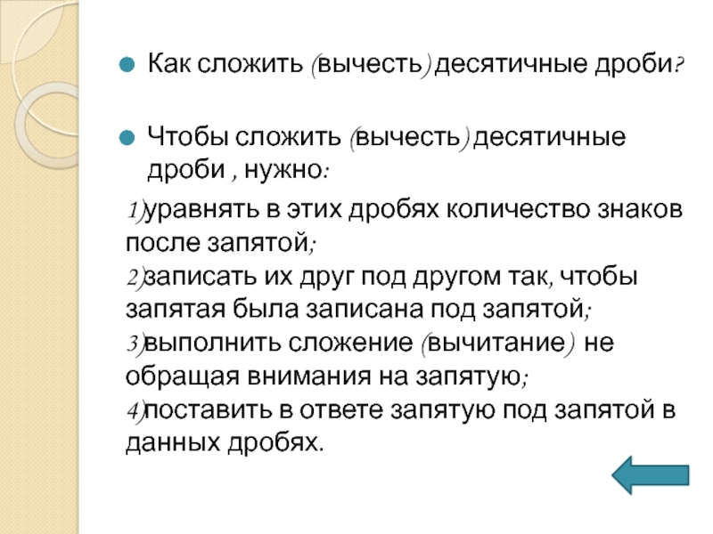 Слайд 12Как сложить (вычесть) десятичные дроби?
