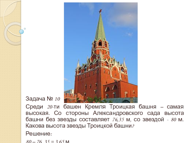 Со стороны Александровского сада высота башни без звезды составляет 76,35 м, со звездой - 80 м. Какова высота звезды Троицкой башни?
