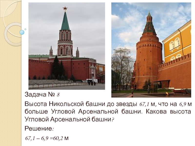 6,9 м больше Угловой Арсенальной башни. Какова высота Угловой Арсенальной башни?