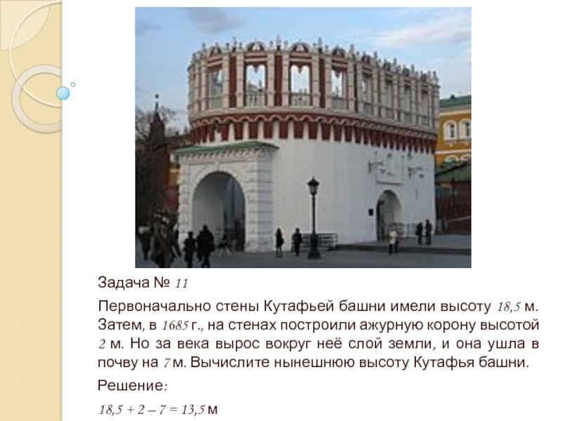 в 1685 г., на стенах построили ажурную корону высотой 2 м. Но за века вырос вокруг неё слой земли, и она ушла в почву на 7 м. Вычислите нынешнюю высоту Кутафья башни.
