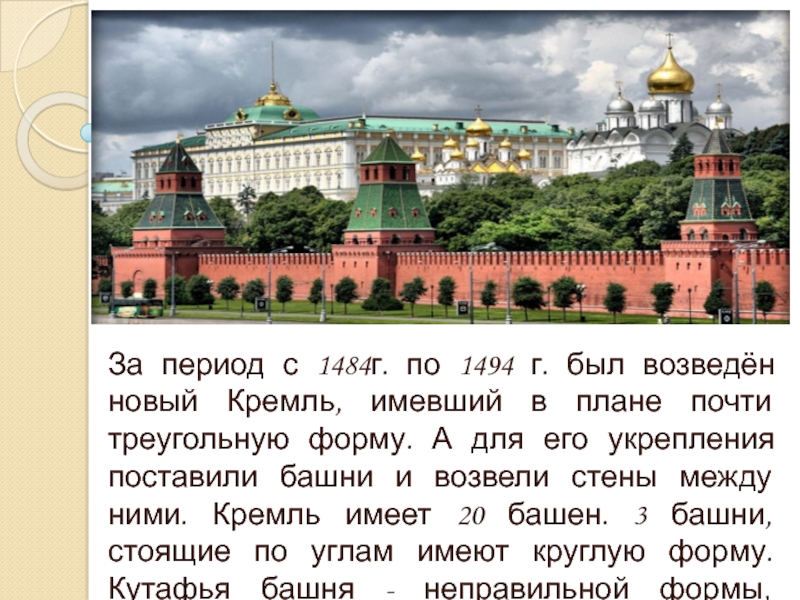 Слайд 22За период с 1484г. по 1494 г. был возведён новый Кремль,