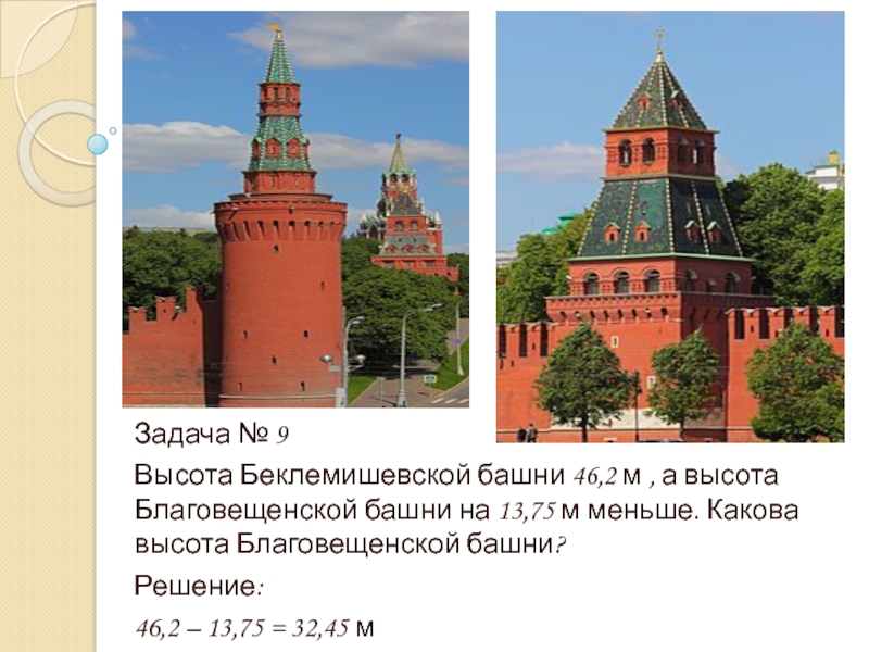 башни на 13,75 м меньше. Какова высота Благовещенской башни?