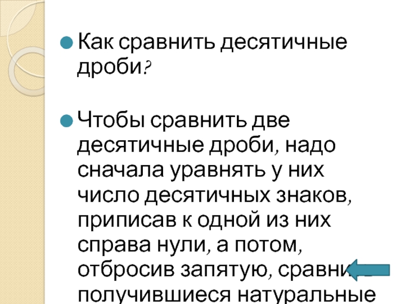 у них число десятичных знаков, приписав к одной из них справа нули, а потом, отбросив запятую, сравнить получившиеся натуральные числа.