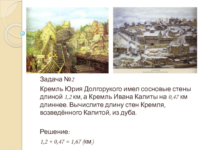 Кремль Ивана Калиты на 0,47 км длиннее. Вычислите длину стен Кремля, возведённого Калитой, из дуба.