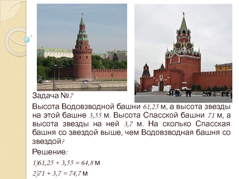 башне 3,55 м. Высота Спасской башни 71 м, а высота звезды на ней 3,7 м. На сколько Спасская башня со звездой выше, чем Водовзводная башня со звездой?