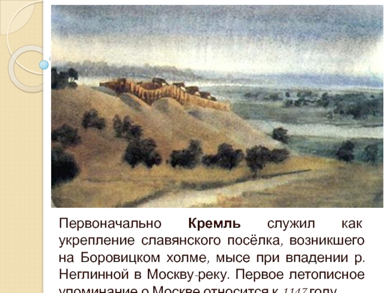 Слайд 13Первоначально Кремль служил как укрепление славянского посёлка, возникшего на Боровицком холме,