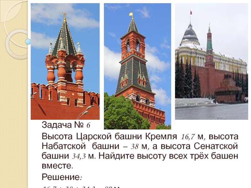 – 38 м, а высота Сенатской башни 34,3 м. Найдите высоту всех трёх башен вместе.