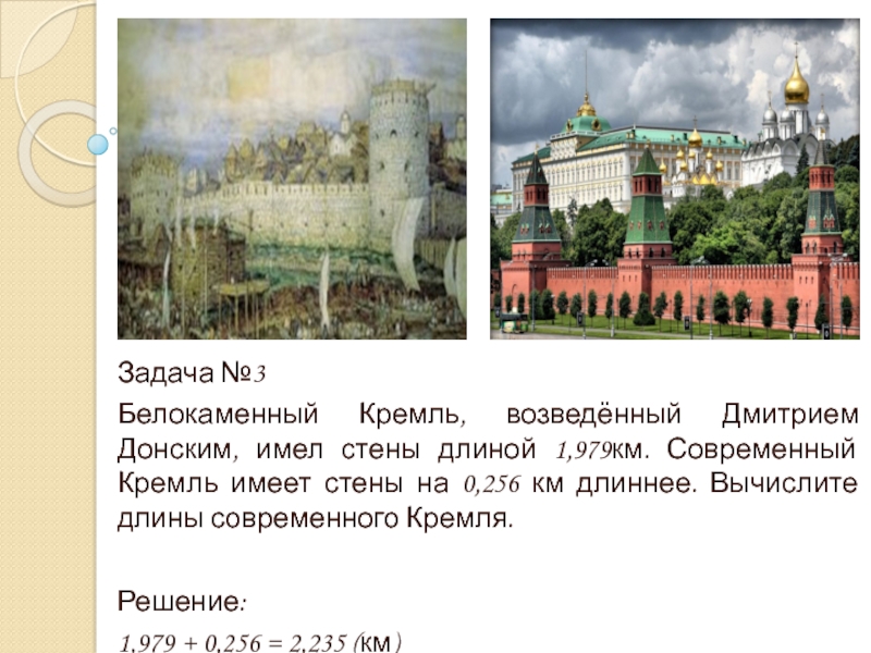 Белокаменный Кремль, возведённый Дмитрием Донским, имел стены длиной 1,979км. Современный