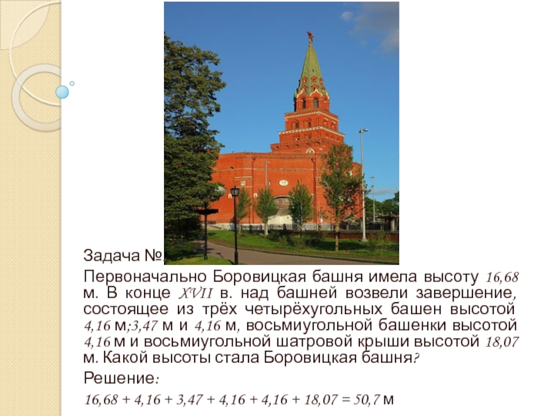 в. над башней возвели завершение, состоящее из трёх четырёхугольных башен высотой 4,16 м;3,47 м и 4,16 м, восьмиугольной башенки высотой 4,16 м и восьмиугольной шатровой крыши высотой 18,07 м. Какой высоты стала Боровицкая башня?