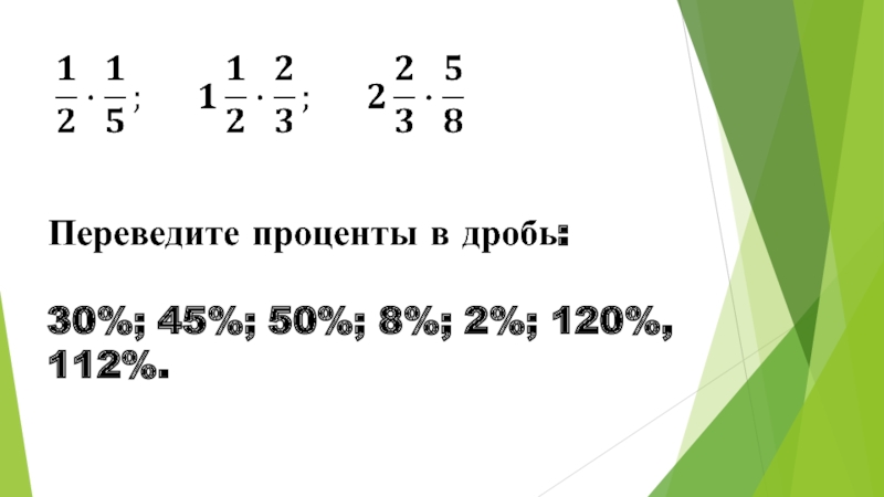 Переведите проценты в дробь: 30%; 45%; 50%; 8%; 2%; 120%, 112%.