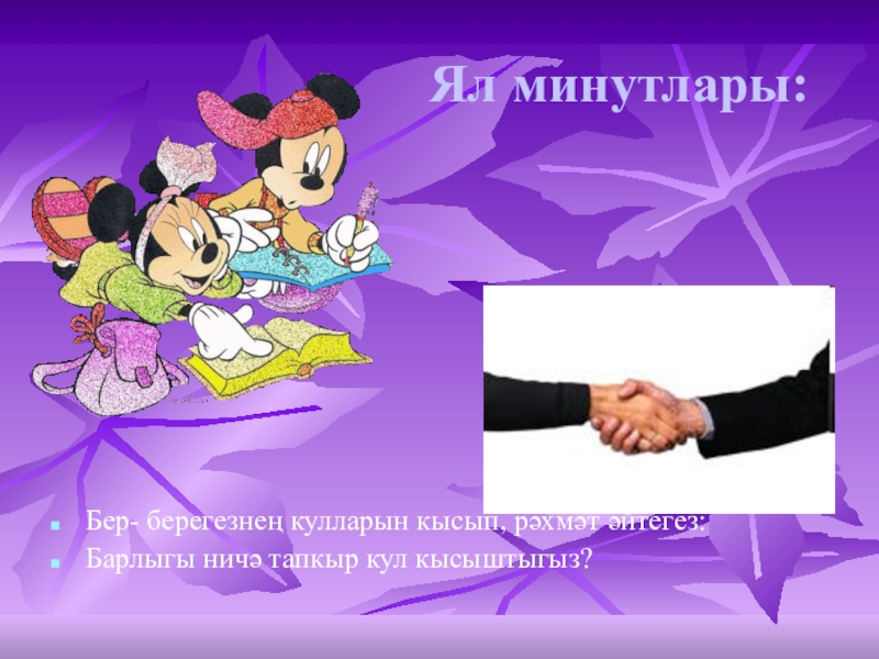 Ял минутлары:Бер- берегезнең кулларын кысып, рәхмәт әйтегез:Барлыгы ничә тапкыр кул кысыштыгыз?