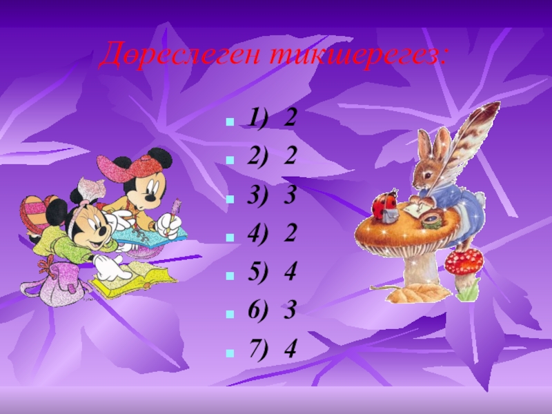 Дөреслеген тикшерегез:1) 22) 23) 34) 25) 46) 37) 4