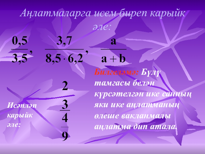 Аңлатмаларга исем биреп карыйк әле:Билгеләмә: Бүлү тамгасы белән күрсәтелгән ике санның яки ике аңлатманың өлеше вакланмалы аңлатма