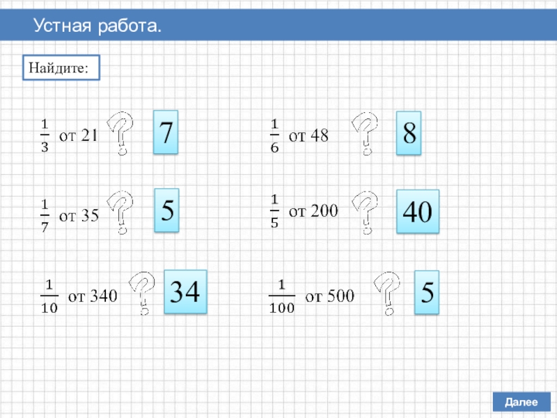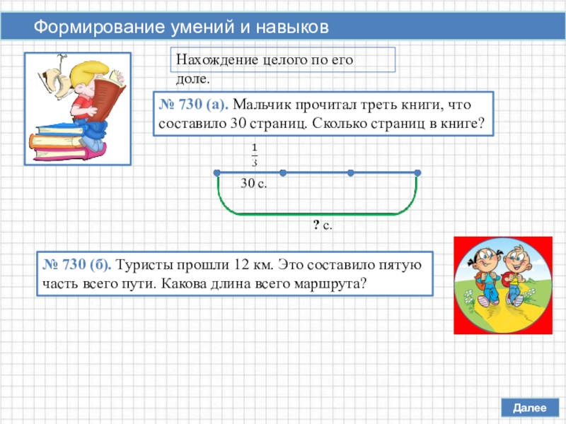 № 730 (б). Туристы прошли 12 км. Это составило пятую часть всего пути. Какова длина всего маршрута?