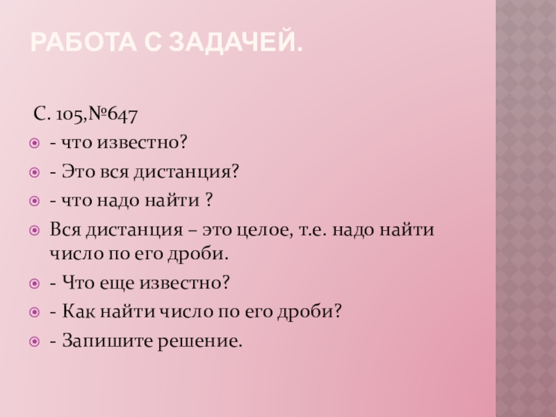 Работа с задачей. С. 105,№647- что известно?- Это вся дистанция?- что надо найти ?Вся дистанция – это