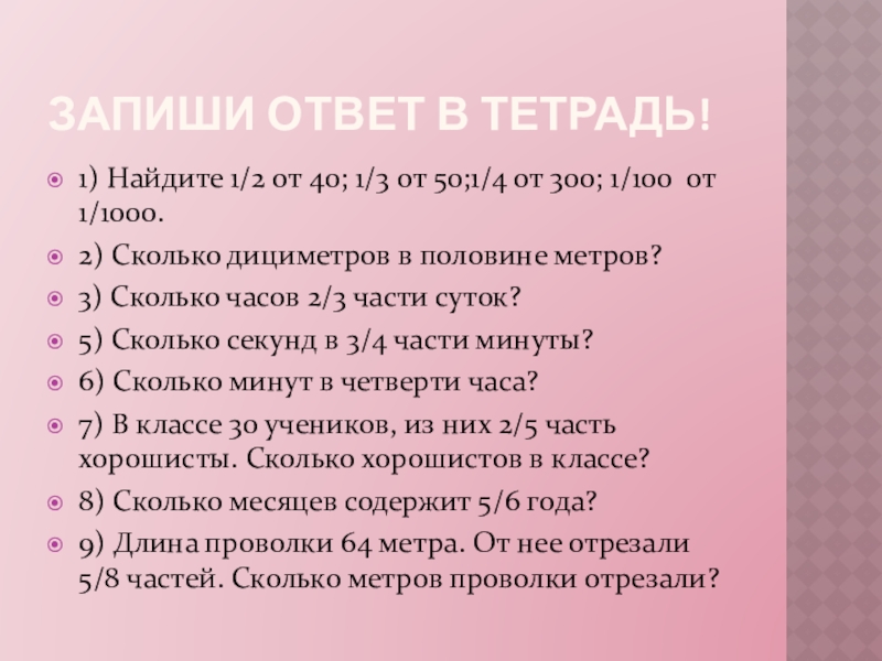 Запиши ответ в тетрадь!1) Найдите 1/2 от 40; 1/3 от 50;1/4 от 300; 1/100 от 1/1000.2) Сколько