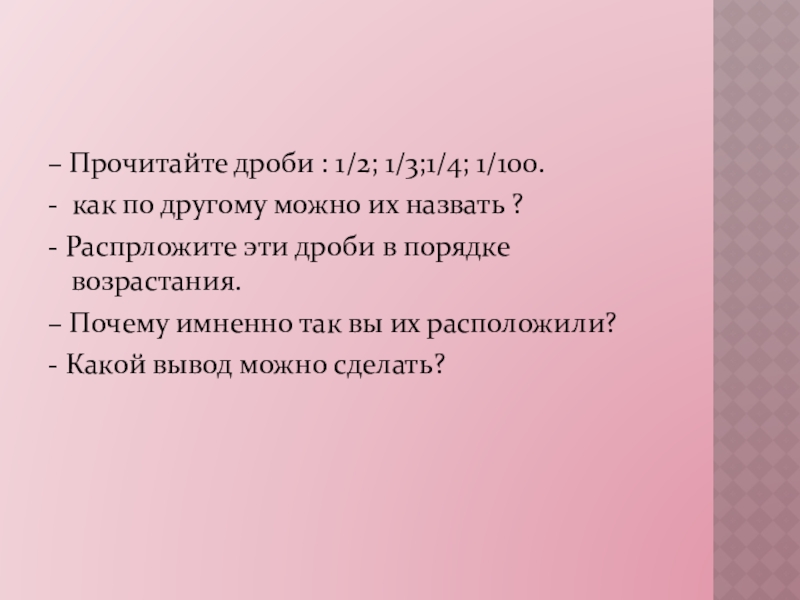 – Прочитайте дроби : 1/2; 1/3;1/4; 1/100. - как по другому можно их назвать ?- Распрложите эти