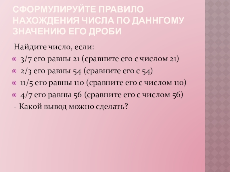 Слайд 7Сформулируйте правило нахождения числа по даннгому значению его дроби