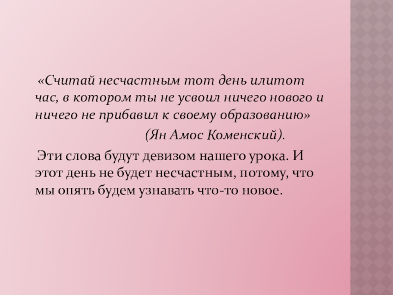 Эти слова будут девизом нашего урока. И этот день не будет несчастным, потому, что мы опять будем узнавать что-то новое.