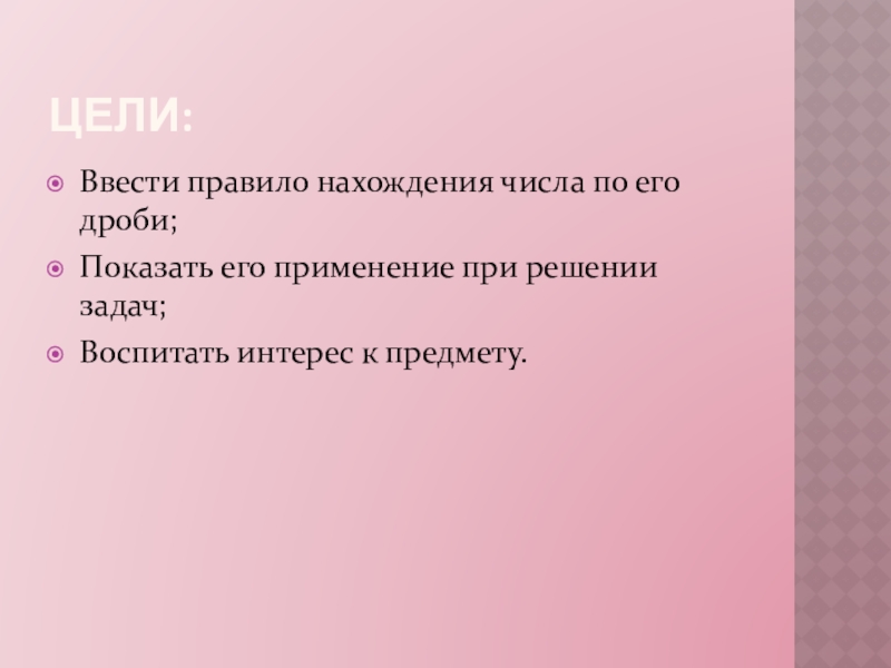 Цели: Ввести правило нахождения числа по его дроби;Показать его применение при решении задач;Воспитать интерес к предмету.