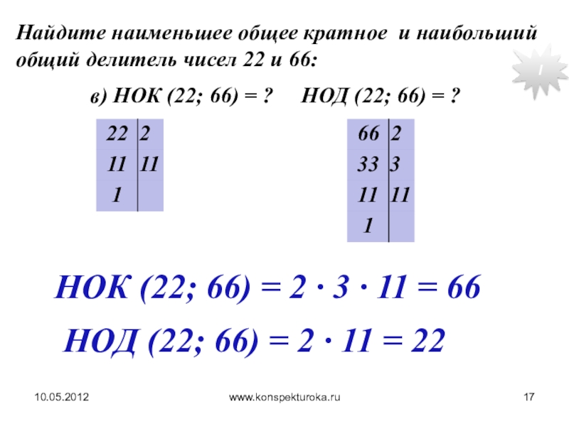 НОК (22; 66) = 2 · 3 · 11 = 66