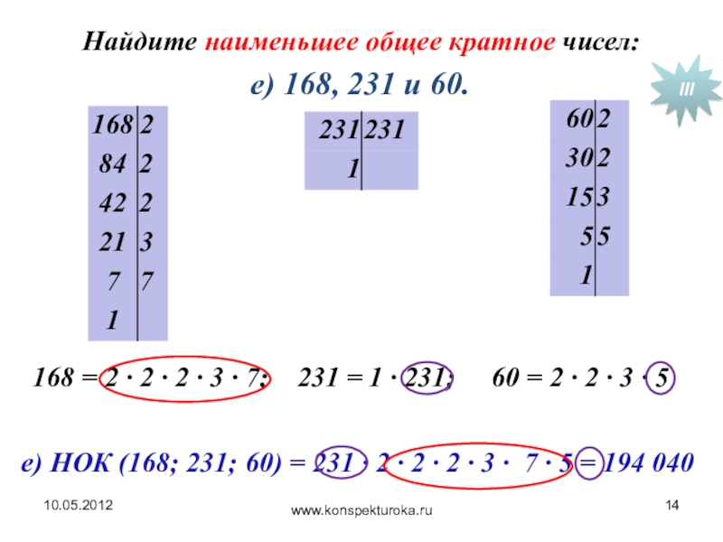 168 = 2 ∙ 2 ∙ 2 ∙ 3 · 7; 231 = 1 · 231; 60 = 2 ∙ 2 ∙ 3 ∙ 5