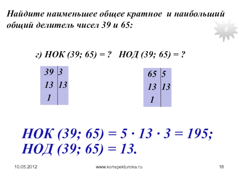 НОК (39; 65) = 5 · 13 · 3 = 195;