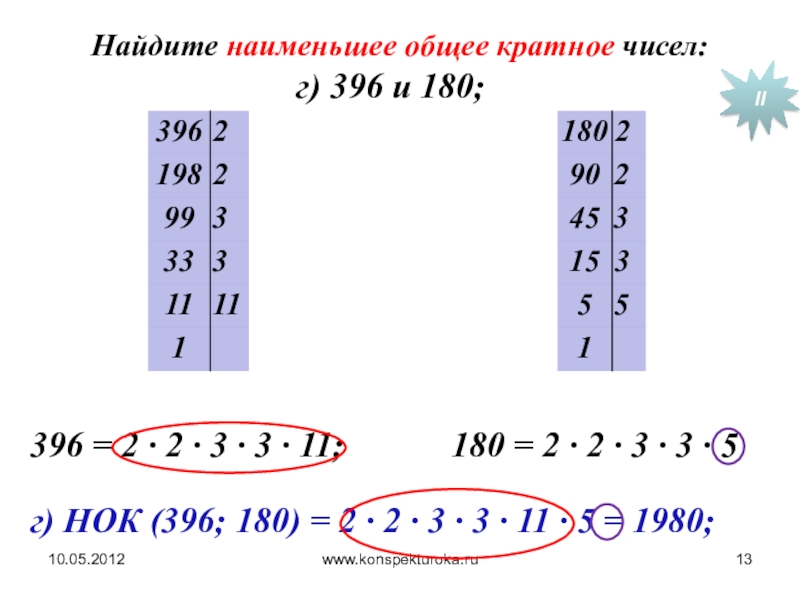 г) НОК (396; 180) = 2 ∙ 2 ∙ 3 ∙ 3 ∙ 11 ∙ 5 = 1980;
