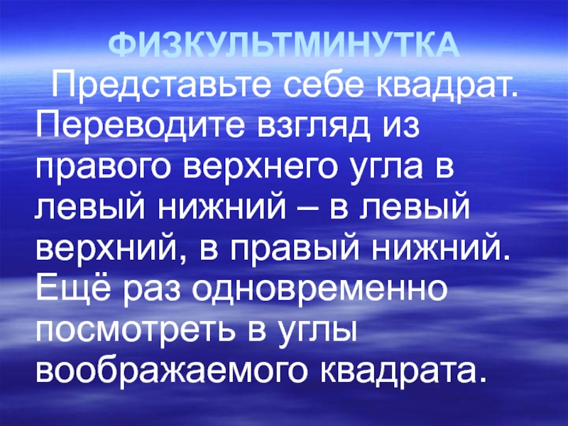 ФИЗКУЛЬТМИНУТКА   Представьте себе квадрат. Переводите взгляд из правого верхнего угла в левый нижний – в