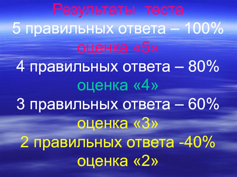 Слайд 21 Результаты теста 5 правильных ответа – 100% оценка «5» 4 правильных ответа – 80% оценка