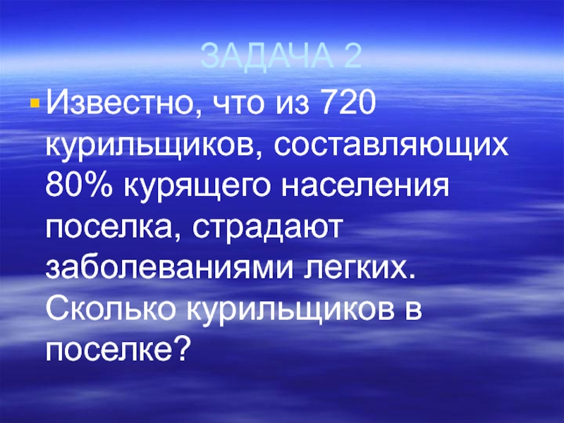 ЗАДАЧА 2Известно, что из 720 курильщиков, составляющих 80% курящего населения поселка, страдают заболеваниями легких. Сколько курильщиков в