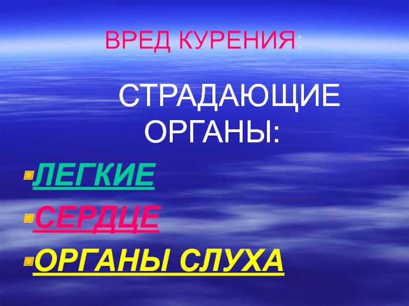 ВРЕД КУРЕНИЯ:     СТРАДАЮЩИЕ ОРГАНЫ: ЛЕГКИЕ СЕРДЦЕОРГАНЫ СЛУХА