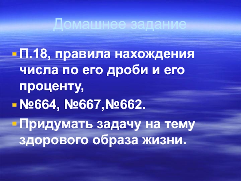 Домашнее заданиеП.18, правила нахождения числа по его дроби и его проценту,№664, №667,№662.Придумать задачу на тему здорового образа